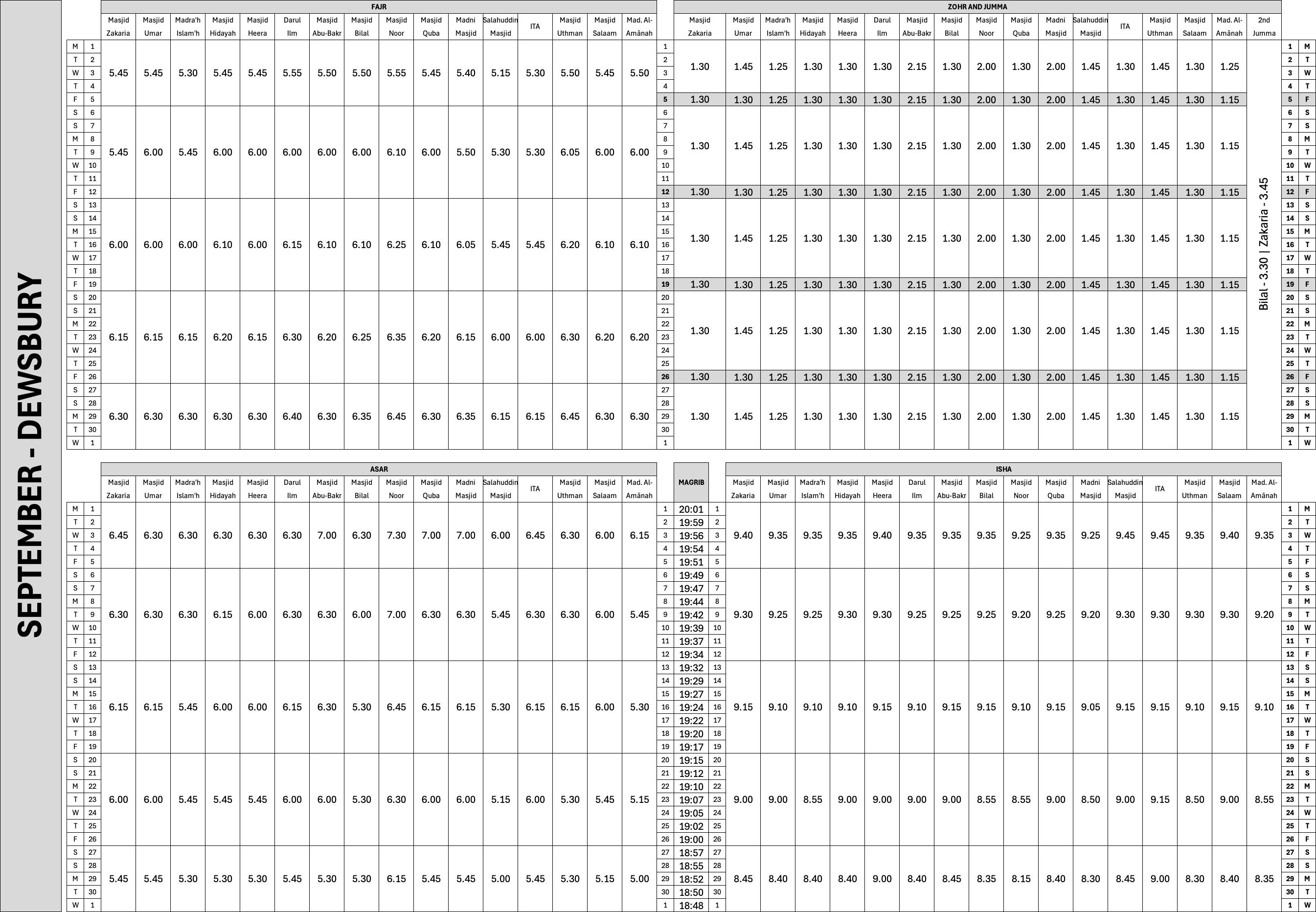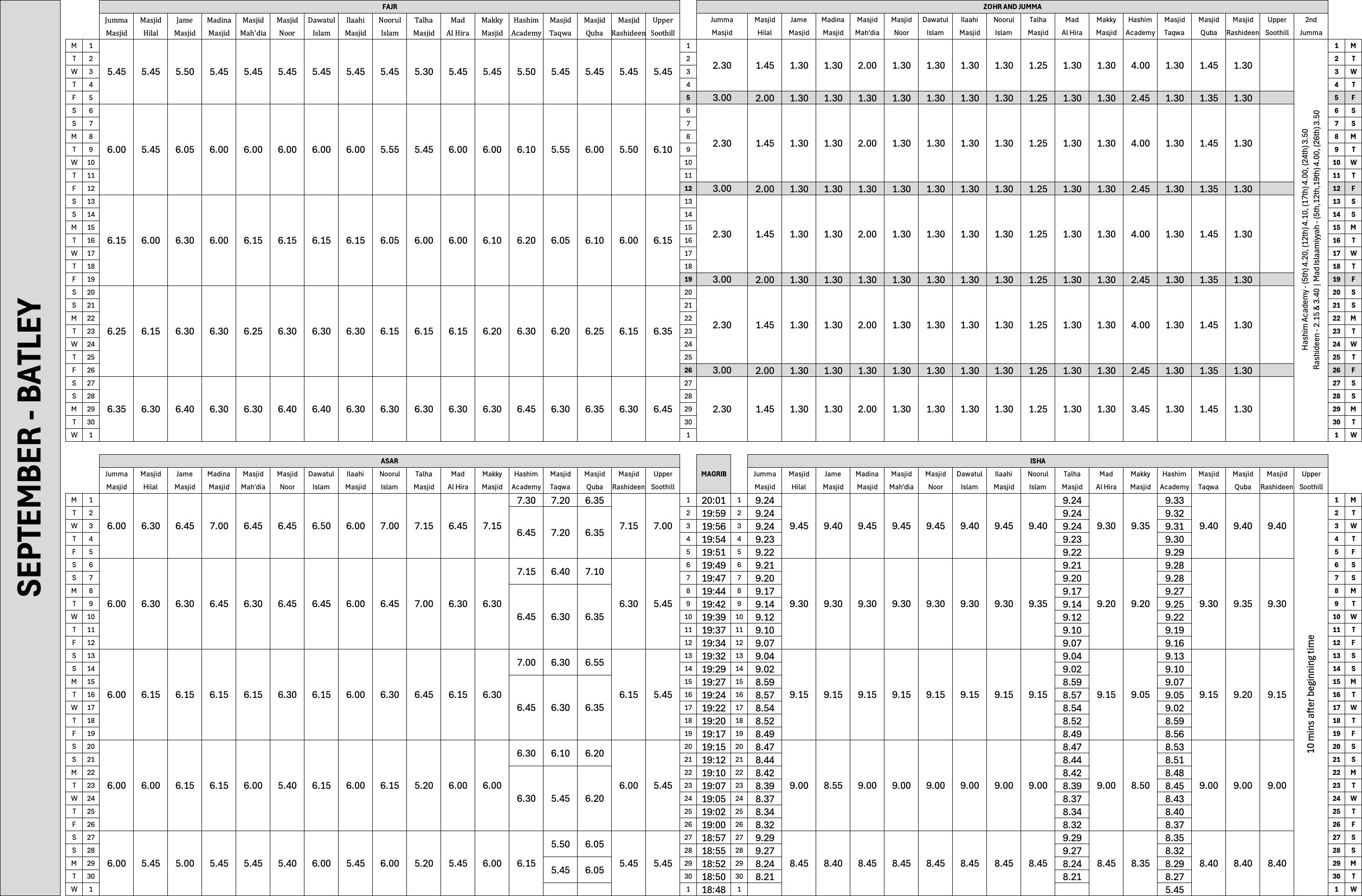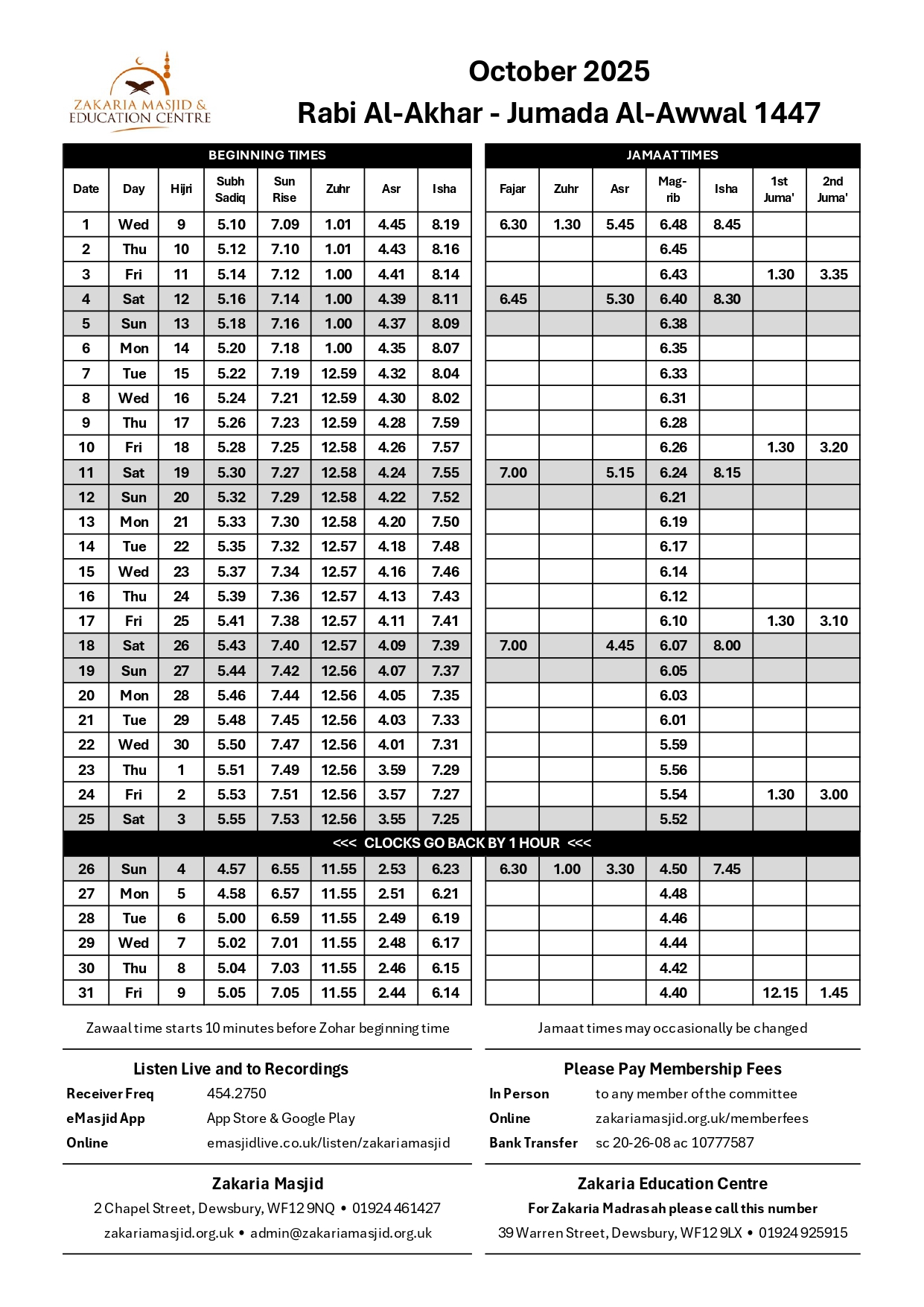 Please click on the timetables to view/save PDFs. Addresses of Masaajid can be downloaded at the bottom of this page. If you would like to add masaajid please email admin@zakariamasjid.org.uk